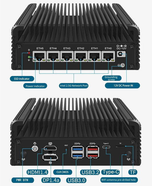 2.5GbE Fanless Firewall PC, 6X i226-v LAN Ports Mini PC with Pentium Gold 8505 5-core 6-Threads, up to 4.4GHz, Support Triple Display, 2X USB3.2 10Gbps, 2X DDR4, 1x M.2 NVMe*4, 2X SATA3.0